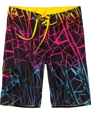 Shattered pieces cover regular length boardshort in sunset coloring. Length 22".
