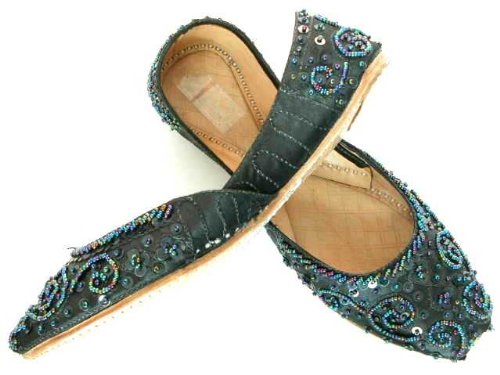 These stunning ethnic shoes are both fashionable and comfortable. They are covered in rich black silk with iridescent sequins and beads, hand sewn by expert craftsmen. Exclusive Beachcombers! designs made in limited quantities, keeping you special and unique. High quality leather for long lasting style. There is no right and left shoe, khussa shoes mold to the exact shape of your foot upon breaking in becoming extremely comfortable. Shoes are designed to be worn in the traditional way with your toes all the way to the tip of the shoe. If you like extra room in the toe area, size up. Size up for half sizes or for wide widths (if you are an 8.5, you should get a 9). See our sizing page for more information.